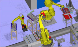Our simulations utilize virtual models of the working environment and of the robots themselves, which offers advantages to both the company and programmer. Robot actions and assembly parts can be visualized in a 3-dimensional virtual environment, months before prototypes are even produced. This allows us to check for any issues or conflicts, saving time and money by identifying costly mistakes before the machine is built.